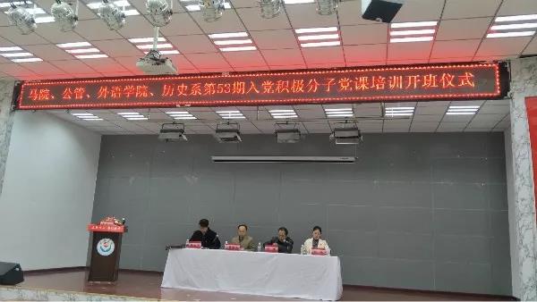 2018年10月20日上午,304am永利集团与马列、公管、历史系党校在外院礼堂举行了第53期入党积极分子培训开班仪式。外国语公司党委书记董振文、马列公司党委副书记张彬、公管公司党委副书记任永平、历史系党总支副书记刘艳及200余名入党积极分子参加了开班仪式。开班仪式由张斌老师主持。