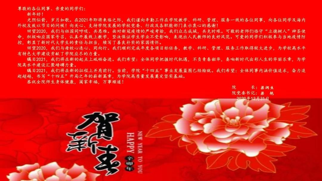 瞩目2021 ,我们将在新的征程上并肩前行。当前,学院 “ 十四五 ” 事业发展蓝图已经绘就。我们希望:全体同事内涵价值追求,奋力追赶超越,书写 “ 十四五 ” 开局之年的崭新篇章,为学院高质量发展奠定坚实基础。恭祝全院师生身体健康,阖家幸福,万事顺遂!
