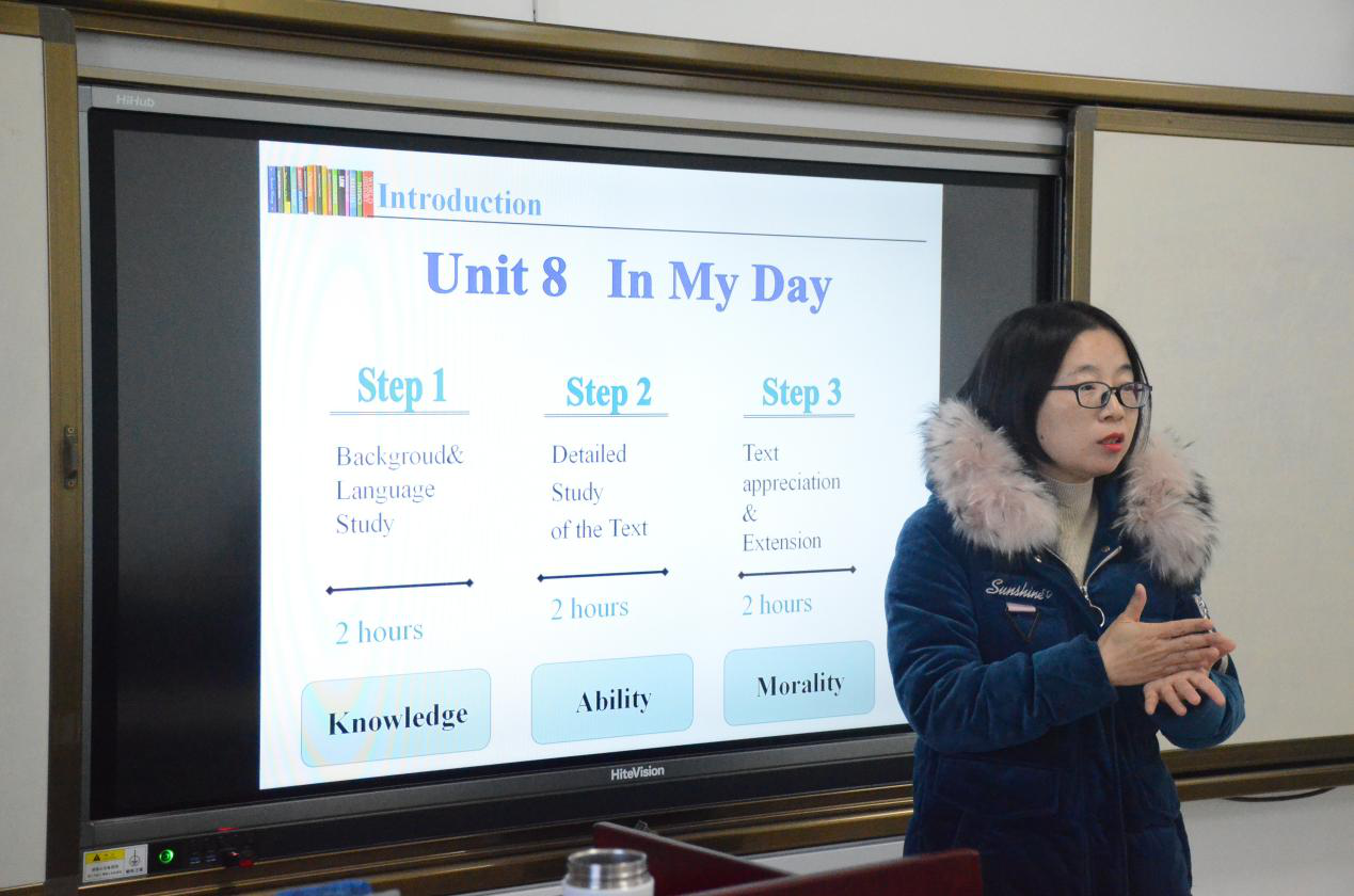 首先,曹艳艳老师结合实际案例讲解了如何备赛,为同学们分析考纲,说明了赛前的必要准备与说课的要求,提出应有整体思维,注重各单元联系,把课程与作业联系在一起。同时就教学设计、内容选取、教学方法选择等方面进行了详细的指导。最后,曹老师以《现代大学英语精读三》中Unit 8的课堂教学为例向参赛者们生动形象的介绍了教学设计中的各个环节。