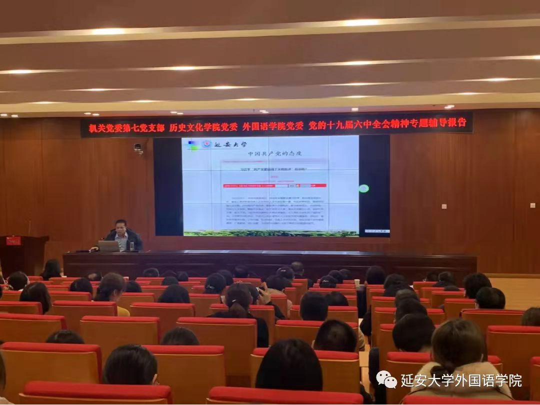 本网讯12月8日下午,副董事长谭虎娃教授在行政楼一楼报告厅作了题为《从党的百年奋斗历程中汲取智慧和力量》的党的十九届六中全会宣讲报告。机关党委第七党支部、历史文化学院、304am永利集团全体教工及部分员工党员聆听了报告。报告由外国语公司党委书记梁艳主持。