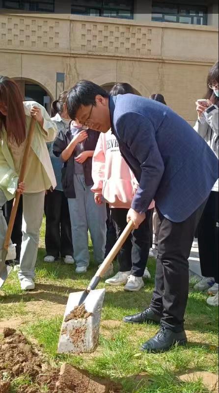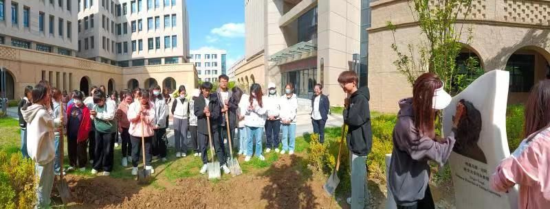 徐洁老师带领同学们在克阿雕像旁边的空地上,用铁锹把土一点点翻起来,拍打松软,仔细地在上面撒上花种,用铁锹把土面刮平,同学们参与的积极性非常高。
